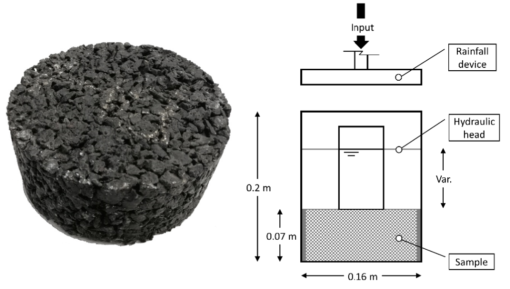 The experimentation part will consist of pouring rainfall with constant intensity over the sample keeping a constant hydraulic head on the surface of the sample. The sample will be placed at the bottom of the cylinder, while a rainfall simulator device supplies water from the upper part under conditions close to reality. The window of the device will allow to observe the water behaviour over the sample and to control the water depth visually