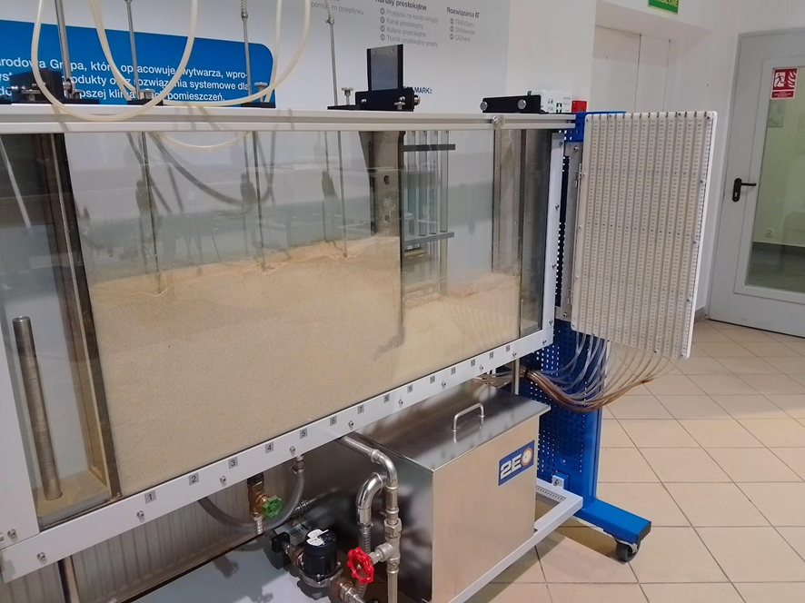 The local flow of groundwater under an obstacle will be presented in the form of an experiment. The model used in experiment 2 (a station consisting of a narrow tank equipped with a number of piezometers for measuring pressure in characteristic cross-sections and a water supply and collection system) can be used to study the flow below the obstacle (figure 9). For this purpose, a sheet pile wall (excavation lining) will be introduced into the model and the given geometry will be recreated (different ground levels on the inflow and outflow sides).